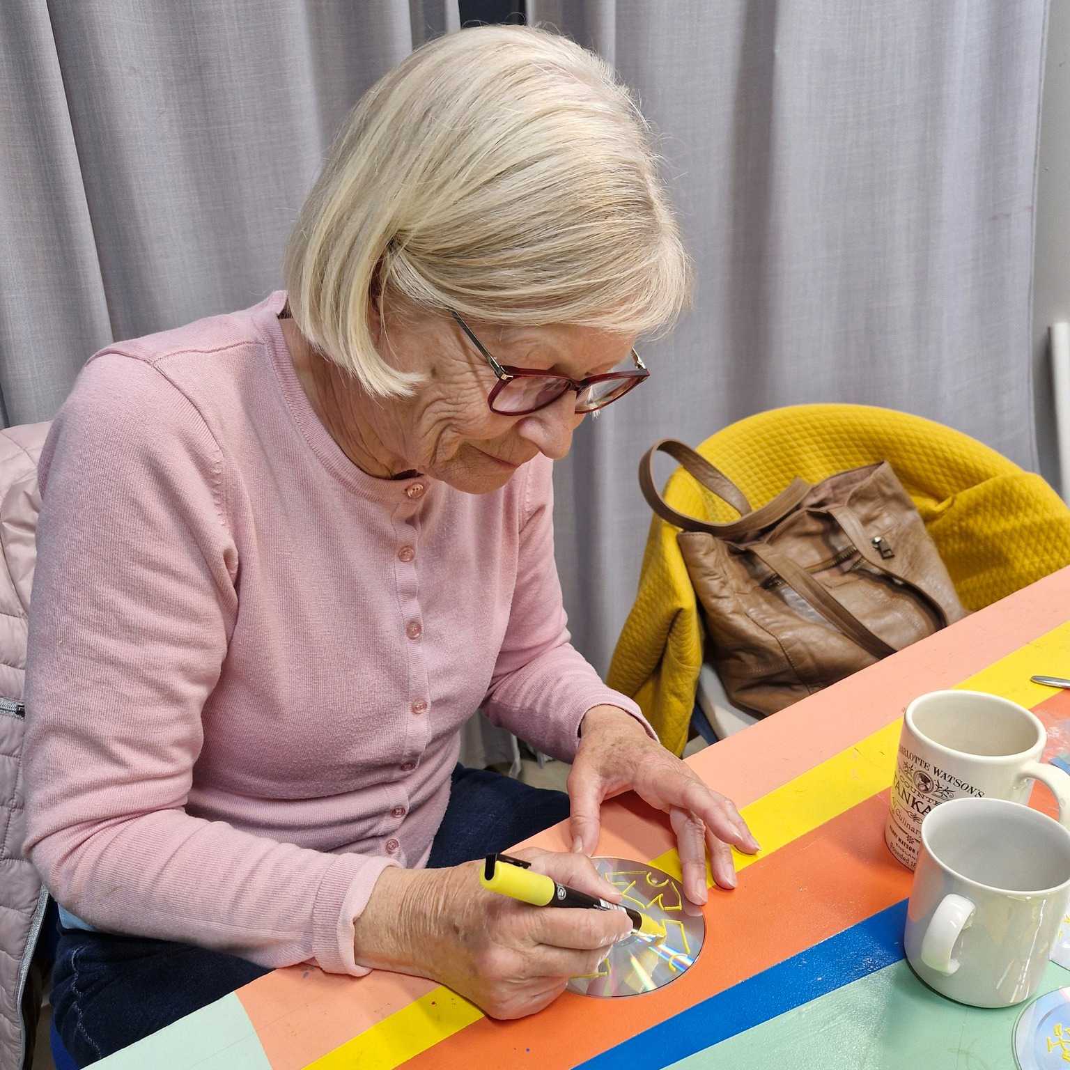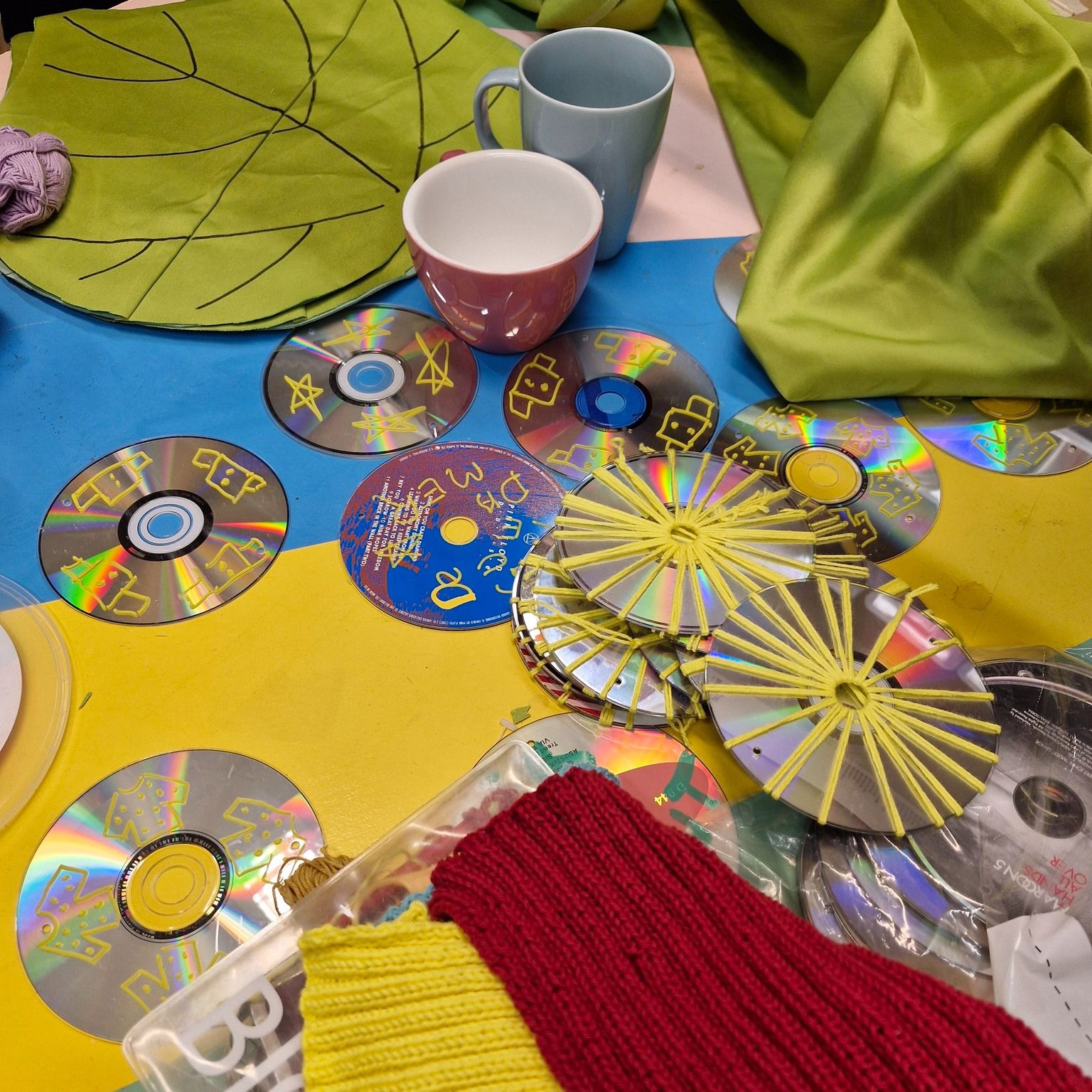 De gule damer bidrager blandt andet til kunstprojektet ’Se op’ ved Sydbank Fonden. Du kan se det endelige kunstværk under DGI Landsstævne fra den 3.-6. juli, hvor værket med de mange farverige CD’er afsløres.