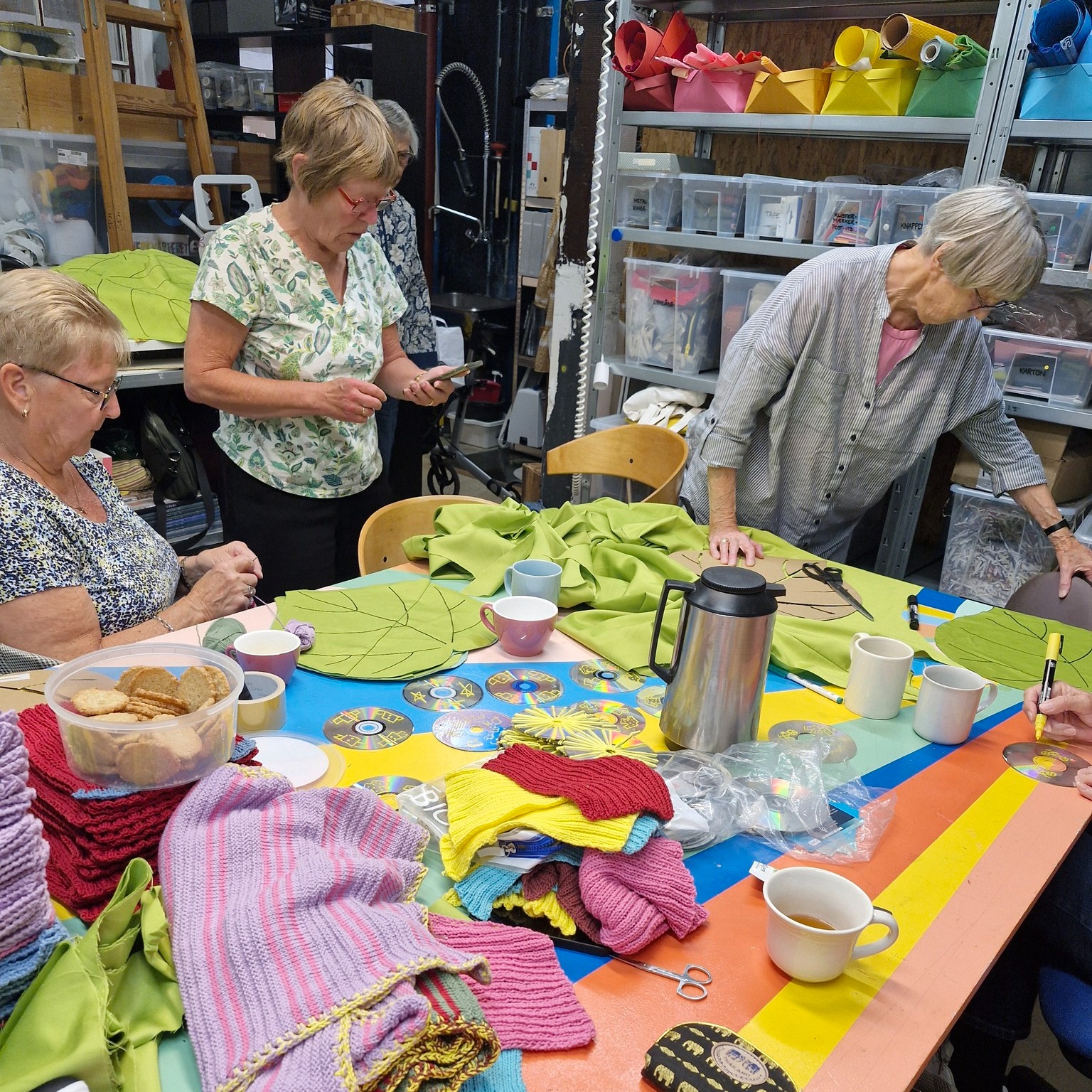 De andre nikker, mens der bliver hældt kaffe op og delt småkager ud langs kreabordet. Samtidig beskriver de deres indsats som et ’afbræk’, ’hygge’ og noget, der ’samler dem’.